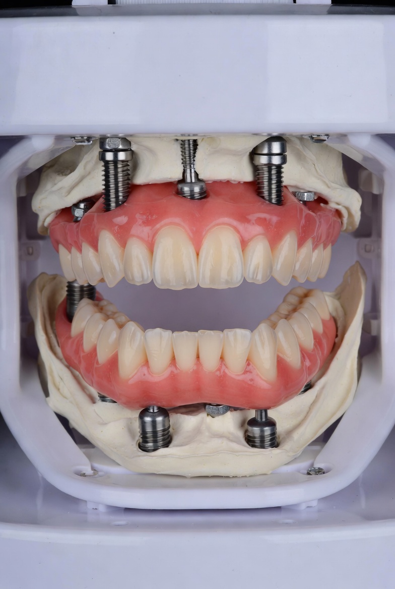 O tratamento consiste na instalação de 4 a 6 implantes de titânio no osso, que servem como base para fixar uma prótese completa, devolvendo a função mastigatória e a estética do sorriso.